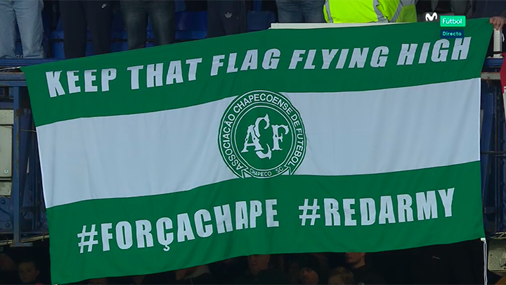 Ενός λεπτού σιγή για τα θύματα της Σαπεκοένσε πριν την σέντρα, τη μνήμη των αδικοχαμένων ανθρώπων τίμησαν και οι οπαδοί της Γιουνάιτεντ (σ.σ που δυστυχώς έχουν και δική τους ανάλογη κακή ανάμνηση) με σημαία που κρέμασαν στο γήπεδο.